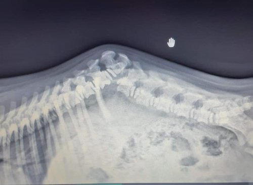 Moses wurde dann bei uns in der Tierklinik vorgestellt. Aber er ist zu klein, um operiert werden zu können. Da die Wirbelsäule sich im Wachstum befindet, können keine Wirbel versteift werden. Zwei der Klinikleiter haben sich intensiv mit dem Fall beschäftigt und raten dazu, abzuwarten, eventuell wäre eine OP möglich, wenn er ausgewachsen ist.