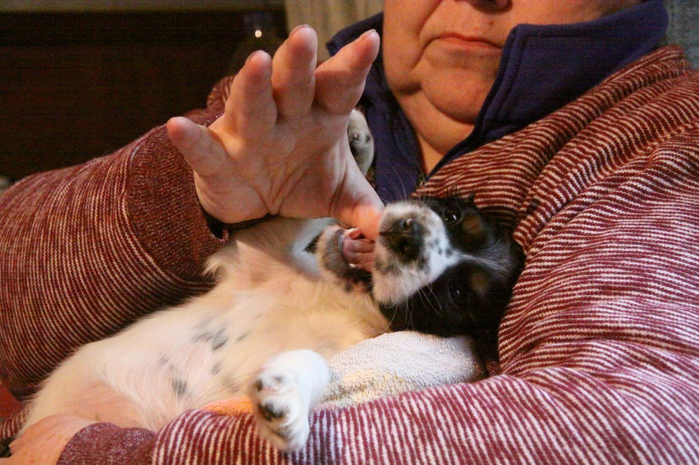 Moses entwickelt sich sehr gut. Er verliert jetzt seine Milchzähne, die ersten neuen Schneidezähne sind schon da. In Bezug auf sein Gangbild kann man sagen, dass Moses besser läuft, als man zu hoffen gewagt hatte, dass er im Vergleich zu gesunden Hunden seines Alters aber etwas instabil ist. Dennoch rieten die Ärzte beim Kontrolltermin letzte Woche wieder dazu, auf Physiotherapie vorerst zu verzichten. Im Januar wird Moses wieder in der Klinik vorgestellt, man wird sehen, wie die Entscheidung dann ausfällt.