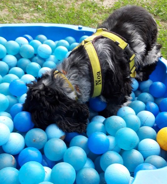 Wir gehen weiterhin mit den Mäusen zur Hundeschule in die Fit, Fun und Furchtlos Gruppe und durch Trolli traut sich Noa immer wieder doch noch etwas Neues zu. Vor ein paar Wochen hat sie sich sogar ins Bällebad getraut, in das Trolli mit Begeisterung springt.