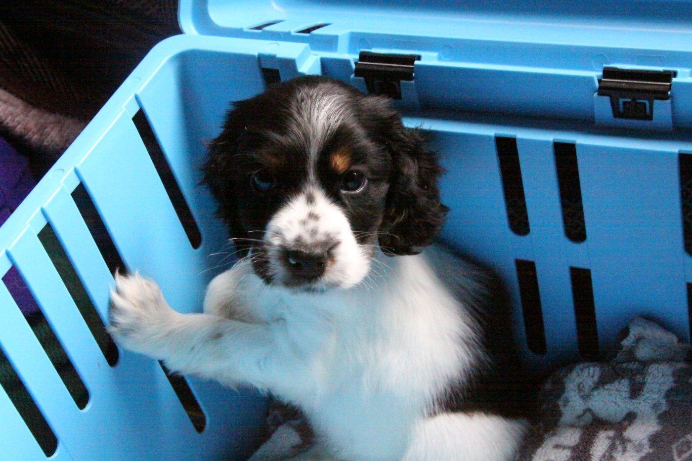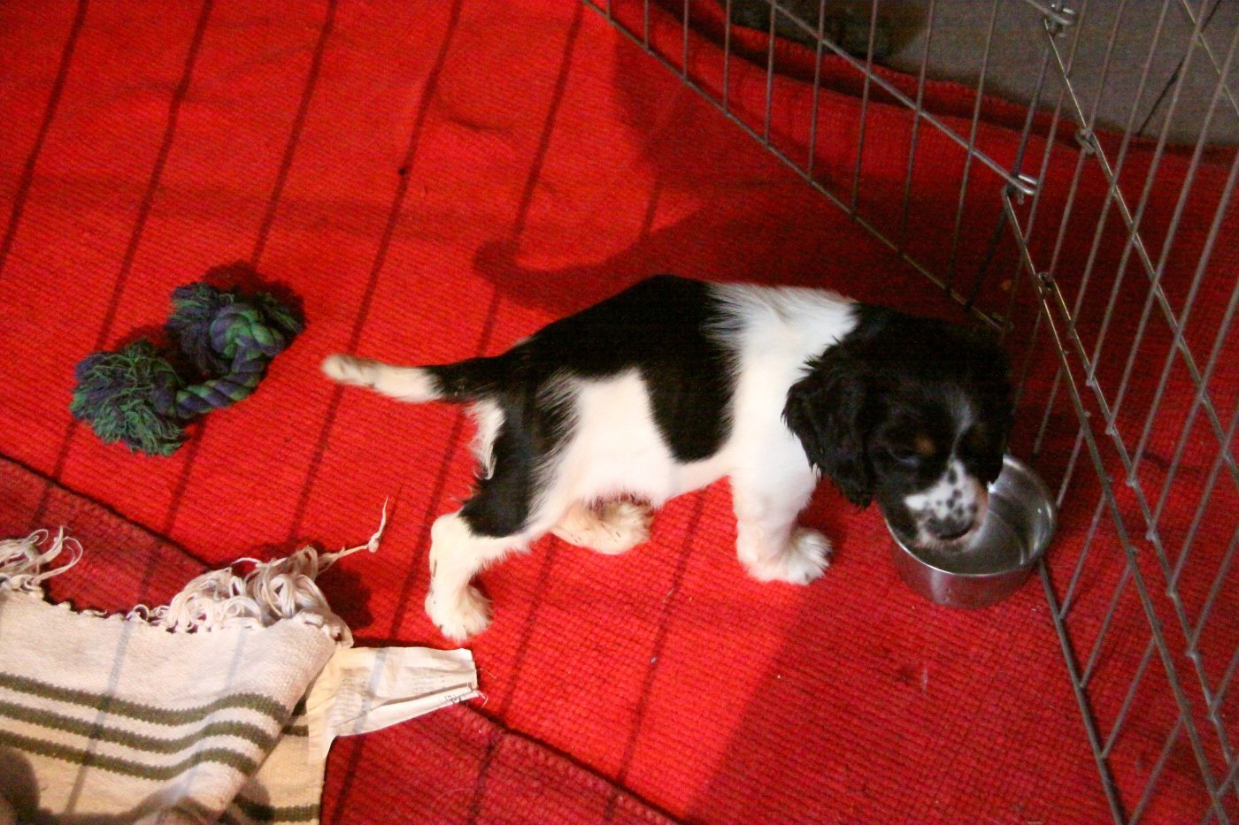 Moses verbrachte die erste Zeit hauptsächlich innerhalb seines „Welpengitter-Schutzbereiches“. Die kleinste Hündin der Familie leistete ihm hier öfters Gesellschaft, denn Moses sollte den Kontakt zu anderen Hunden kennenlernen. Das tat ihm sehr gut - die beiden sind jetzt ein Herz und eine Seele und spielen miteinander. Auch der Kontakt zu den anderen Hunden des Familienrudels wird immer besser. Zuhause ist Moses jetzt nur noch in seinem Laufstall, wenn die Hunde ihr Fressen bekommen, wenn er den Pflegefrauchen bei der Hausarbeit zu übermütig zwischen den Beinen umherrennt, oder wenn die Hunde mal allein bleiben müssen.