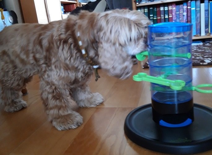 Dafür spricht, dass wir inzwischen eine sehr viel lebhaftere Trolli kennen lernen als wir je hatten. Sie hat nun keine Lust mehr, nach dem Frühstück mit Noa ein Schläfchen zu halten. Nein, sie möchte bespaßt werden, am liebsten mit einem Spiel mit Leckerchen. Wenn ich zu Hause bin, kommt sie mit hoch und darf mit ihrem Futterball durchs Wohnzimmer toben oder wir machen Suchspiele. Das findet sie ganz toll. Dann will sie meistens wieder runter und dort schauen, ob es vielleicht Essen gibt.