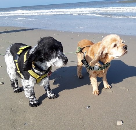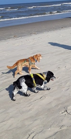 Auf Juist haben die beiden die Spaziergänge am Strand genossen. Da am Strand Leinenpflicht besteht, haben wir beide an eine Langlaufleine gemacht und diese nur bei Bedarf in die Hand genommen. So waren sie doch irgendwie frei, lediglich wenn einer rechts und die andere links gegangen sind, dann war irgendwann Schluss... Unser Pärchen hat dabei häufig ein Lächeln ins Gesicht anderer Strandläufer gezaubert.