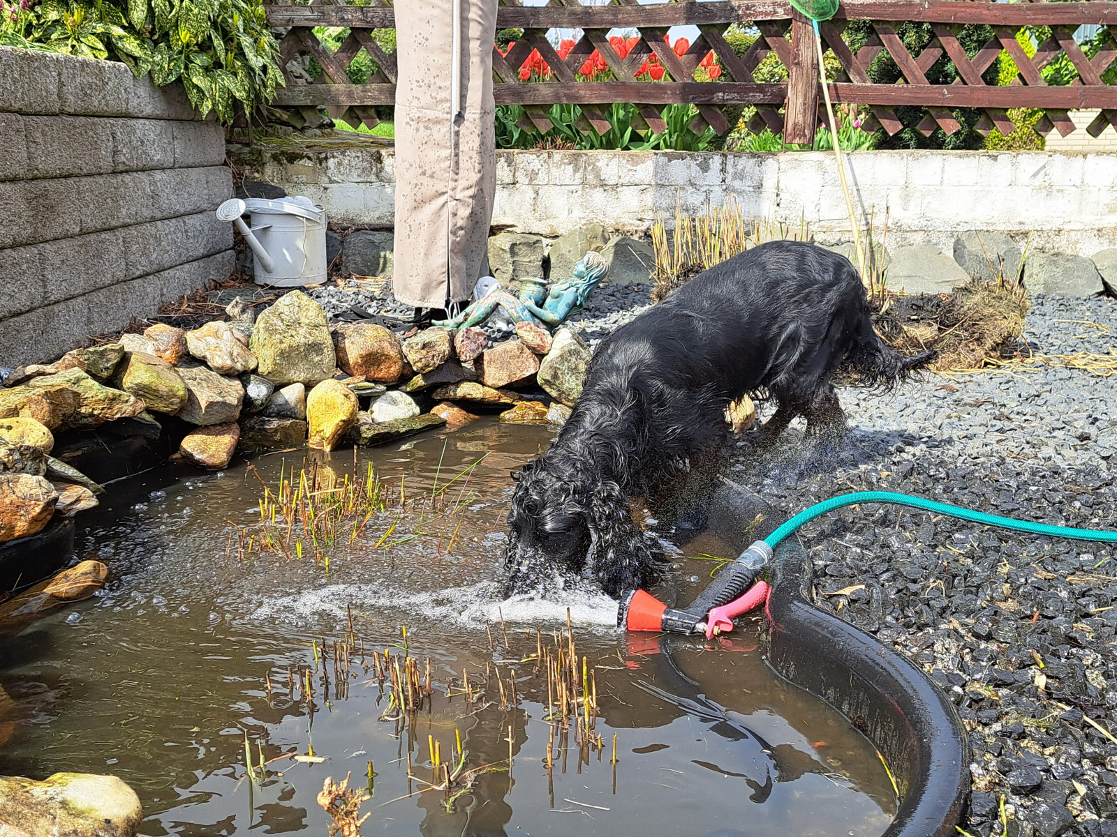 Wenn er länger als 2 Minuten alleine im Garten ist, muß man gucken gehen, dann stellt er wieder irgend etwas an. Letztens haben wir das gesamte Wurzelwerk aus unserem Miniteich rausgeholt und sauber gemacht, Sky war voll in seinem Element, das war voll sein Ding