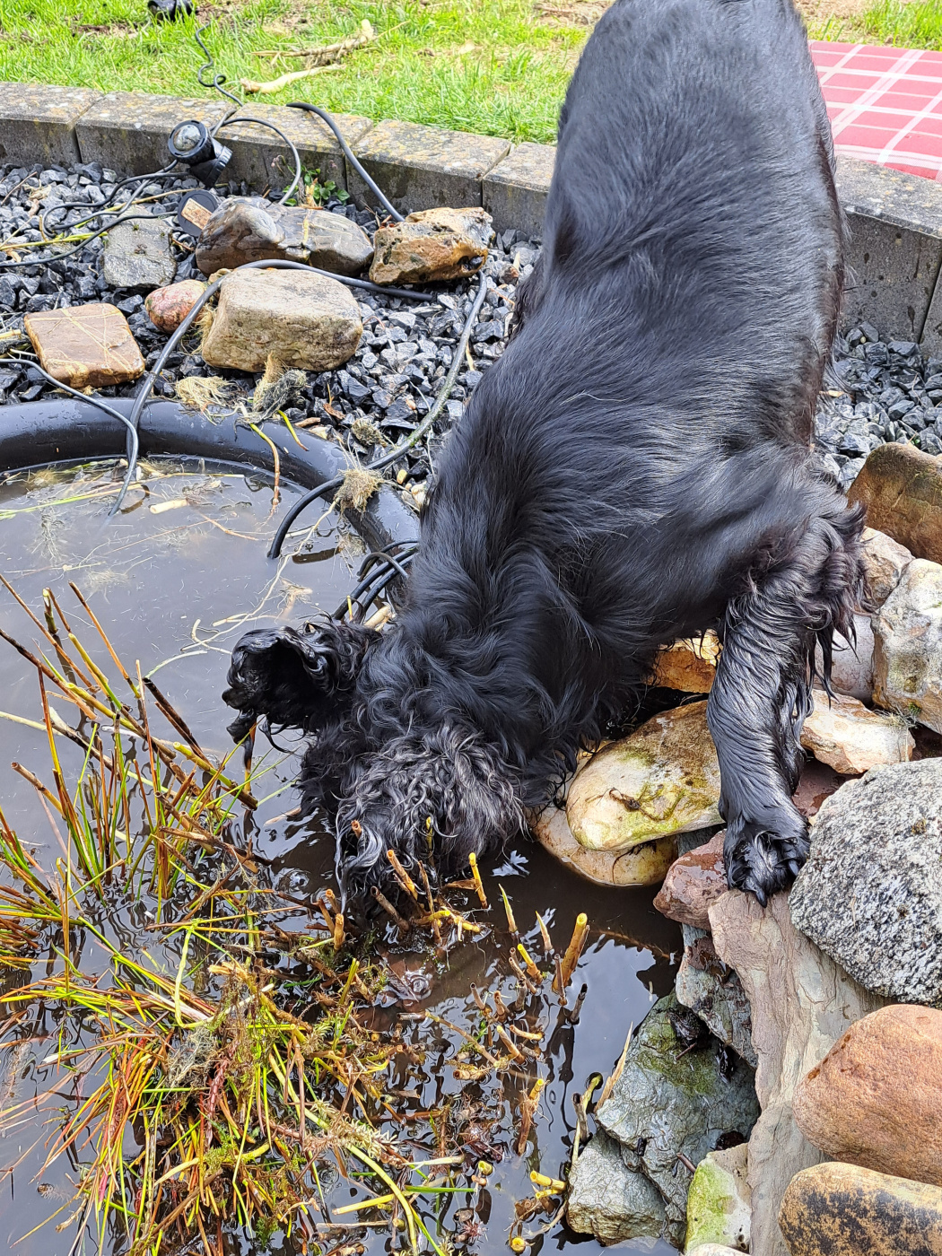 Wenn er länger als 2 Minuten alleine im Garten ist, muß man gucken gehen, dann stellt er wieder irgend etwas an. Letztens haben wir das gesamte Wurzelwerk aus unserem Miniteich rausgeholt und sauber gemacht, Sky war voll in seinem Element, das war voll sein Ding