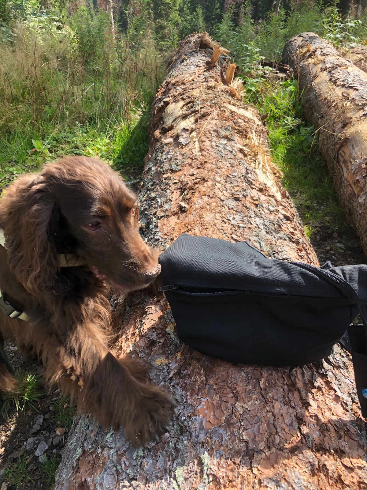 Zum Glück hatten wir genug Verpflegung dabei. Versteckt im Rucksack und in Frauchens schwarzer Tasche: