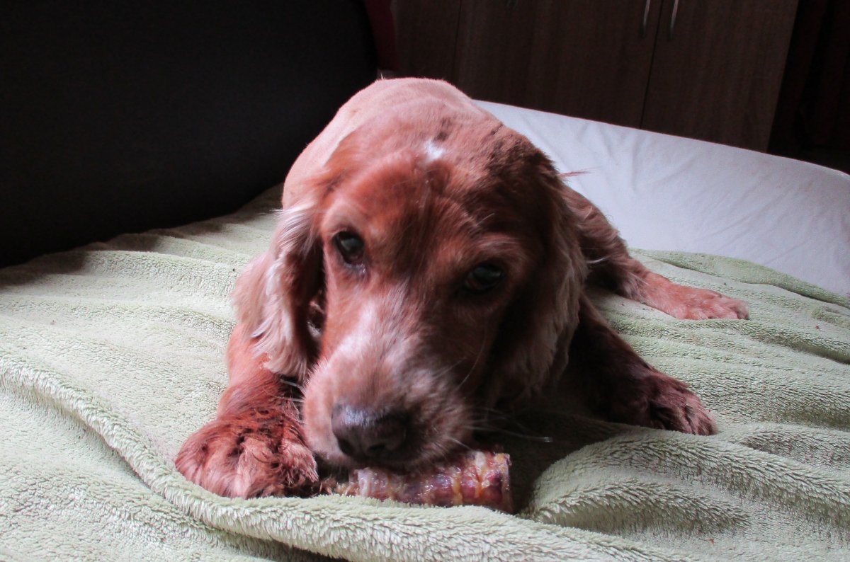 Leider leidet unsere Elsy an einer chronischen Maulentzündung. Im Moment bekommt sie Cortison. Wir haben ihr Fell kurz schneiden müssen, da sie viel sabbert. Aber Kauknochen schmecken noch