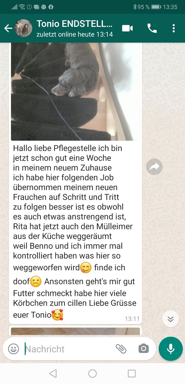 Super das es Tonio so gut geht ,ich hoffe er hat ein langes Leben mit seiner neuen Familie.