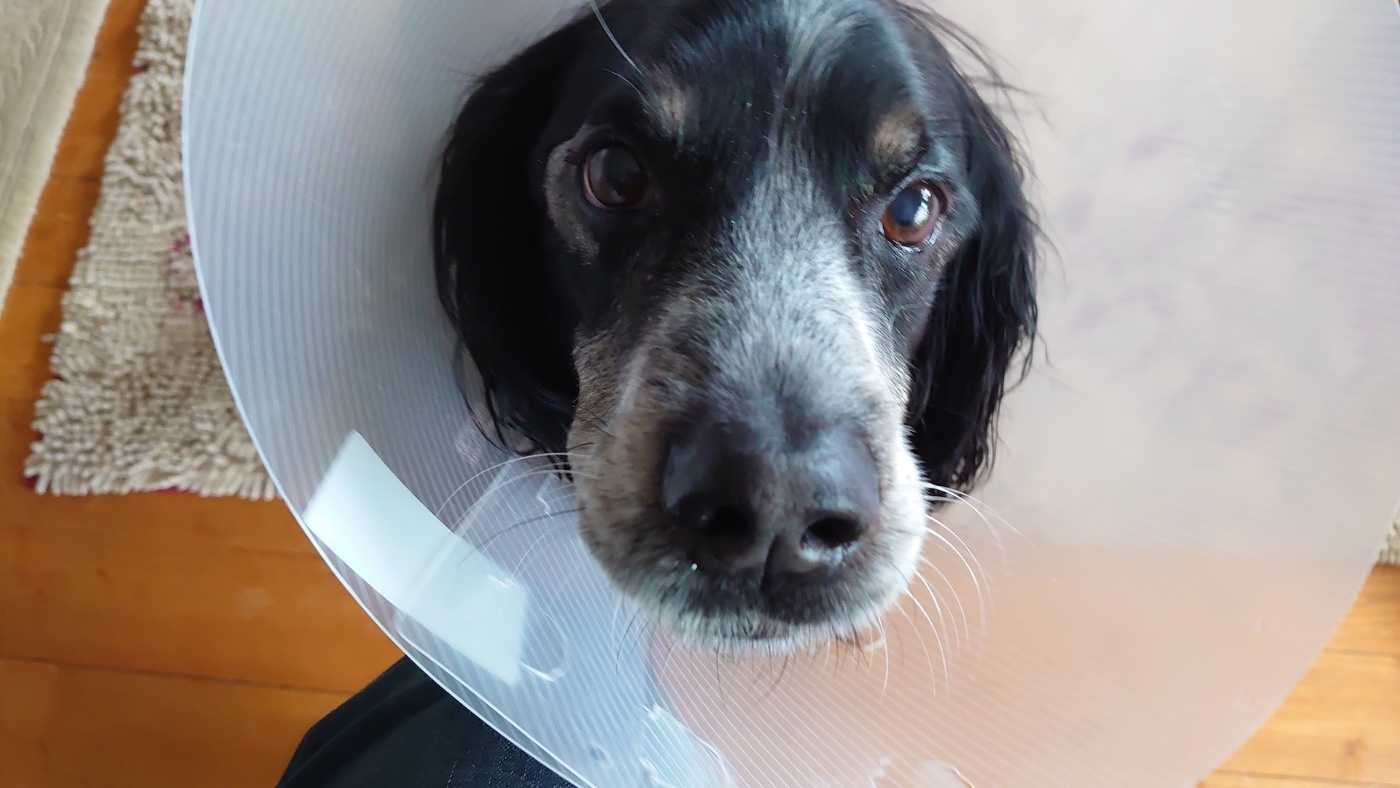Ich hatte große Bedenken, ob und wie „Selam mit Trichter“ wohl funktionieren wird, aber er hat uns mal wieder positiv überrascht. Er läuft super mit dem Trichter! Was allerdings genau so gekommen ist, wie vermutet: wir dürfen natürlich keine Augensalbe geben, da mutiert er zur Bestie. Also fahren wir zur TÄ, denn dort ist unser Monster so mit Zittern beschäftigt, dass er das Knurren und Schnappen ganz vergisst. Vor Angst reißt er die Augen weit auf – sehr praktisch für die TÄ! Die OP-Wunden sehen alle gut aus. Nur der Trichter stört ihn mittlerweile sehr, verständlicherweise, denn das drückt und reibt ja ständig am Hals. Mehrmals am Tag hat er Kratzanfälle, in die er sich regelrecht reinsteigert. Mitte der Woche wird entschieden, ob wir das Teil abnehmen dürfen, oder ob es noch ein paar weitere Tage draufbleiben muss.