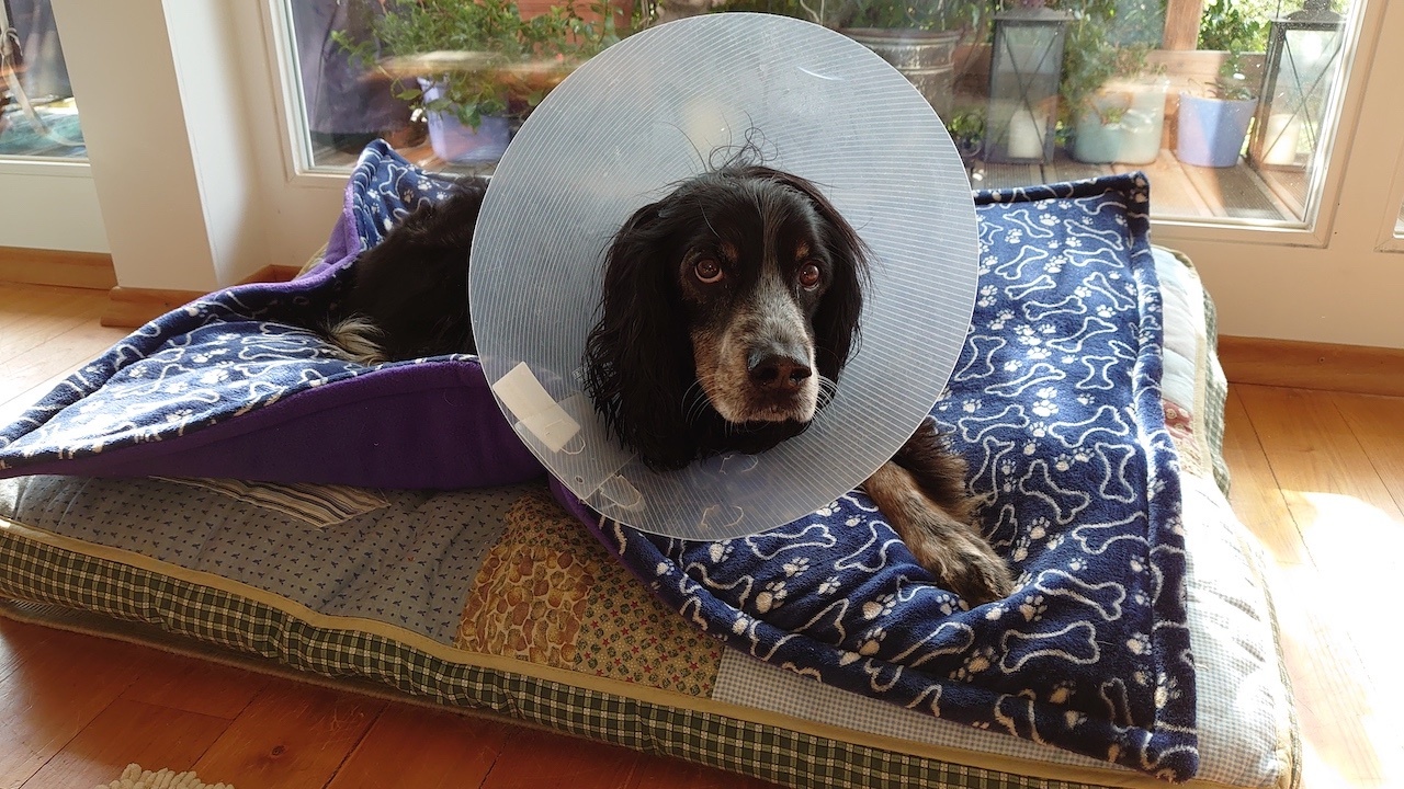 Er hatte zwei kleine Hautwucherungen am Lidrand, eine davon war nun so gewachsen, dass sie auf den Augapfel drückte und entfernt werden musste. Außerdem war an der linken Körperseite wieder ein Atherom gewachsen, was auch entfernt wurde, und die Zähne wurden gereinigt.