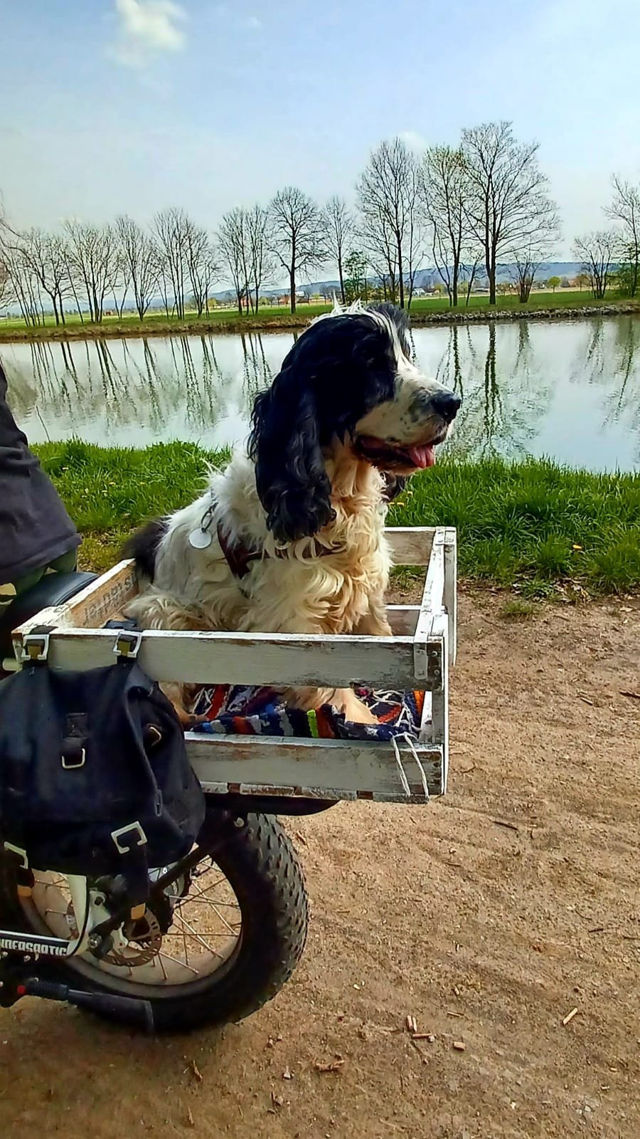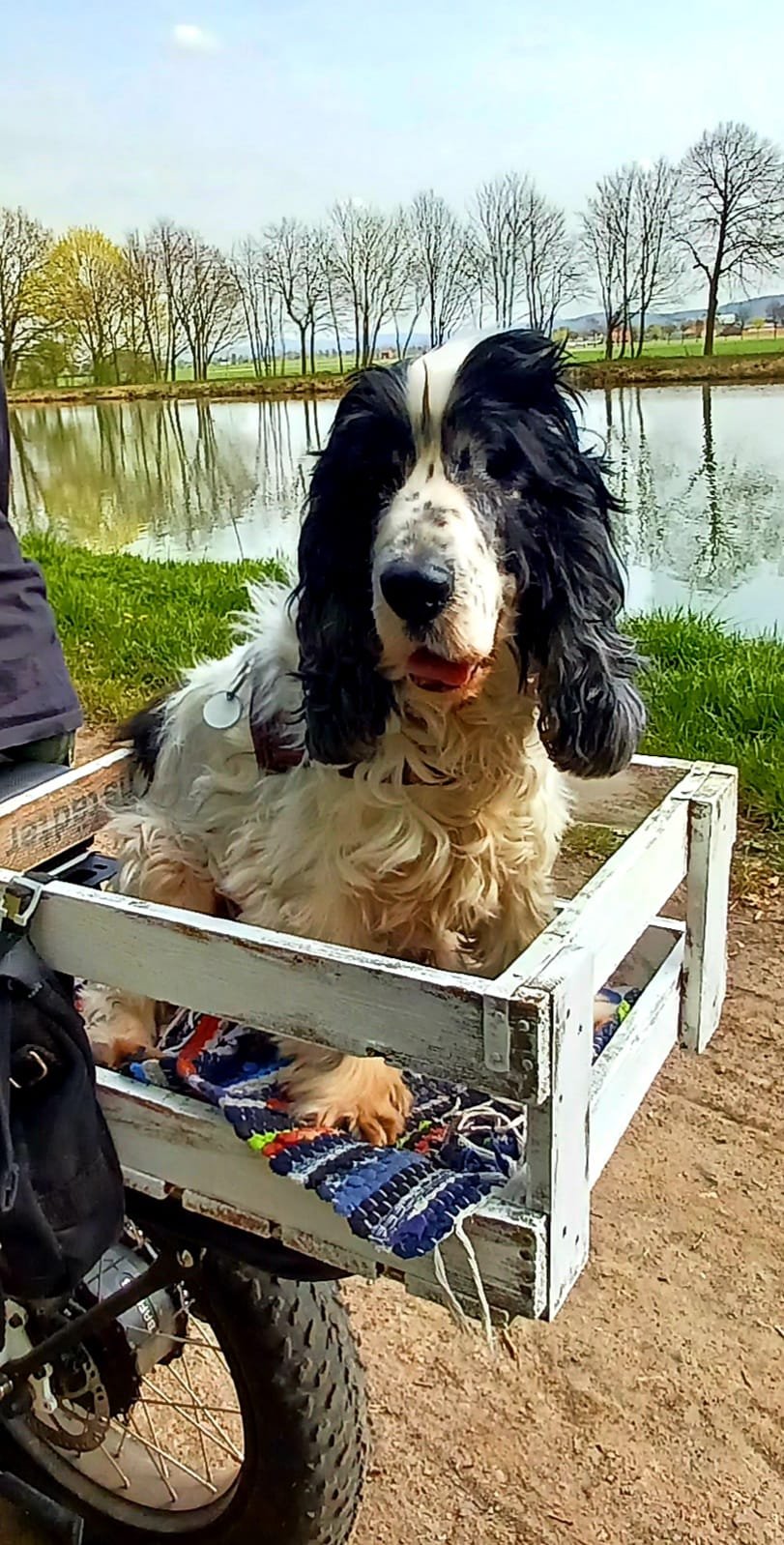Meine Familie denkt sich immer wieder neue, komische Sachen aus.... Weil ich ja im Fahrradanhänger immer schnell fiepe und unzufrieden bin, probieren sie jetzt was anderes aus.... auf Frauchens Rad ist nun eine Kiste. Damit ich näher bei ihr bin, sagt sie.... Momentan komme ich da nur wenige Minuten rein, Herrchen schiebt und Frauchen hält mich fest und gibt mir Leckerlis. Das gefällt mir noch ganz gut. Ein letzter Versuch mich fürs Radfahren zu begeistern sagen sie.....