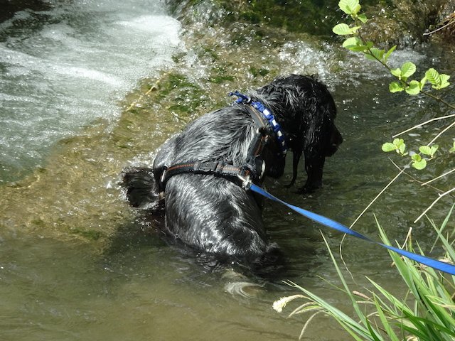 Aber nun zurück zum Gassi - als See-Hund war ich endlich wieder in meinem Element. Ich habe nun auch die Badesaison so richtig eröffnet! Nicht mehr nur Fussbad, sondern richtig schwimmen. Allerdings noch nicht im See - wir waren an einem Bach. Aber schaut selbst...