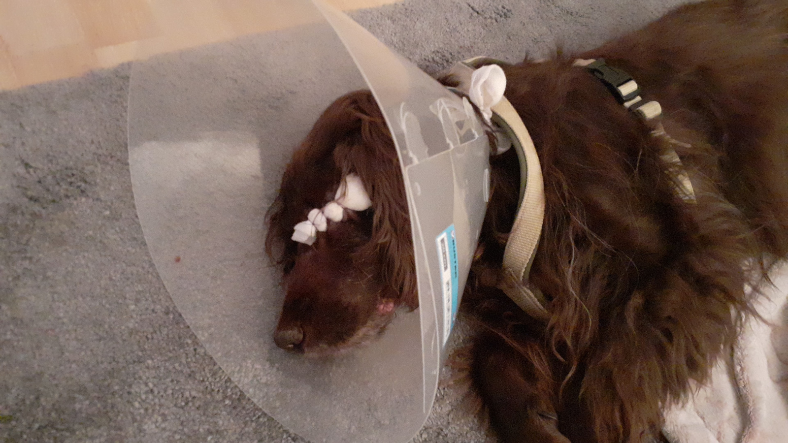 Durch die Nebenwirkungen der Optimune-Augensalbe, gehen mir immer wieder die Haare um die Augen aus. Frauchen findet, ich sehe aus wie ein kleiner Pirat