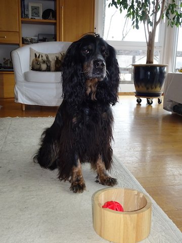 Dann was Neues lernen - wir nennen es "Aufräumen". Das geliebte Bällchen holen und in die Holzschale legen - wir üben noch.