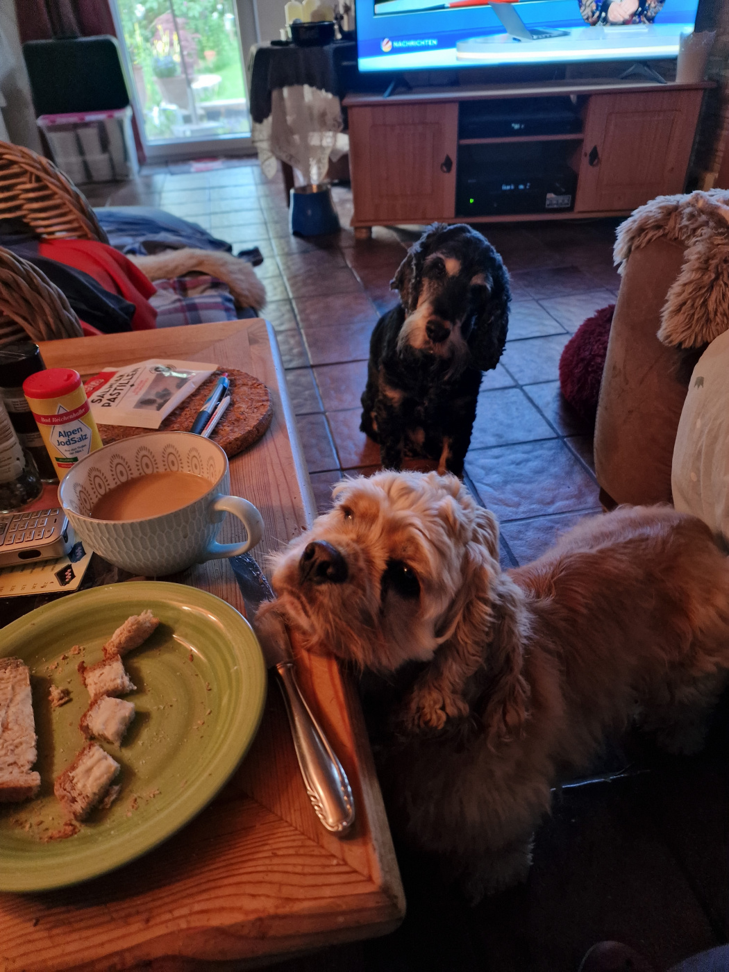 So kann der Tag beginnen, Buttertoast von Frauchen in mundgerechte Häppchen geschnitten :rolleyes: :a40