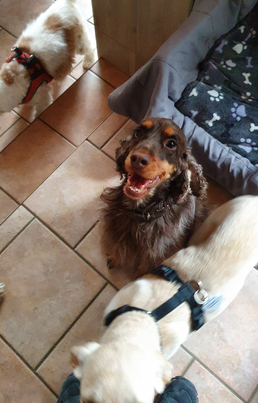 Als wir bei ihm in Unna ankamen, war wie immer eine Menge von Vierbeinern, die mich stürmisch aber freundlich empfangen haben vor Ort. Ihr wisst es, ich sehe zwar nicht so aus, aber ich bin eher der schüchterner Cockerbub. Ok, einige Vierbeiner kannte ich ja schon: Der große Luis, der alte Kumpel Joui , der mittlerweile blinde und taube Caramel und das immer noch verfressende Brüderchen Mattis. Aber da waren wieder Einige, die ich noch nicht kannte. Die mussten natürlich Alle an mir rumschnüffeln und mich erst einmal genau betrachten