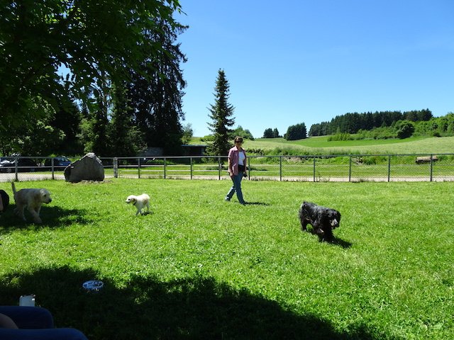 Das Thema des ersten Tages war die Körpersprachen von uns Hunden. Da durften (fast) alles zusammen im eingezäunten Gehege frei laufen, sie wurden dabei beobachtet und gefilmt. Ein paar "Wackelkandidaten", zu denen man auch mich zählte (warum nur???), durften aber nicht mit der ganzen Meute, sondern nur mit den ruhigen und souveränen Trainer-Hunden frei laufen. Die zwei blonden Mädels waren aber echt ok - ich habe sie kurz abgecheckt und dann war es mir viel wichtiger, mein Frauchen und vor allen Dingen Herrchen (denn der war nicht mit im Gehege!) im Auge zu behalten. Am zweiten Tag ging es um Leinenführung und Körpersprache der Zweibeiner. Erst wurde einzeln geübt und durch die berühmte "Gasse" gelaufen. In der Zeit haben wir anderen in der Sonne gefaulenzt. Nein, nein - natürlich waren wir ganz aufmerksam und haben genau zugehört und aufgepasst...