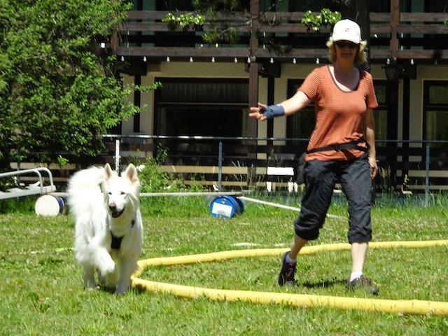 Am dritten Tag ging es wieder um Körpersprache. Wir durften/mussten Longieren ausprobieren. Zuerst mussten die Zweibeiner ohne uns Hunde üben. Also irgendwie sah das alles schon seltsam aus - da habe ich mir schon überlegt, was das bloss wieder sein soll...