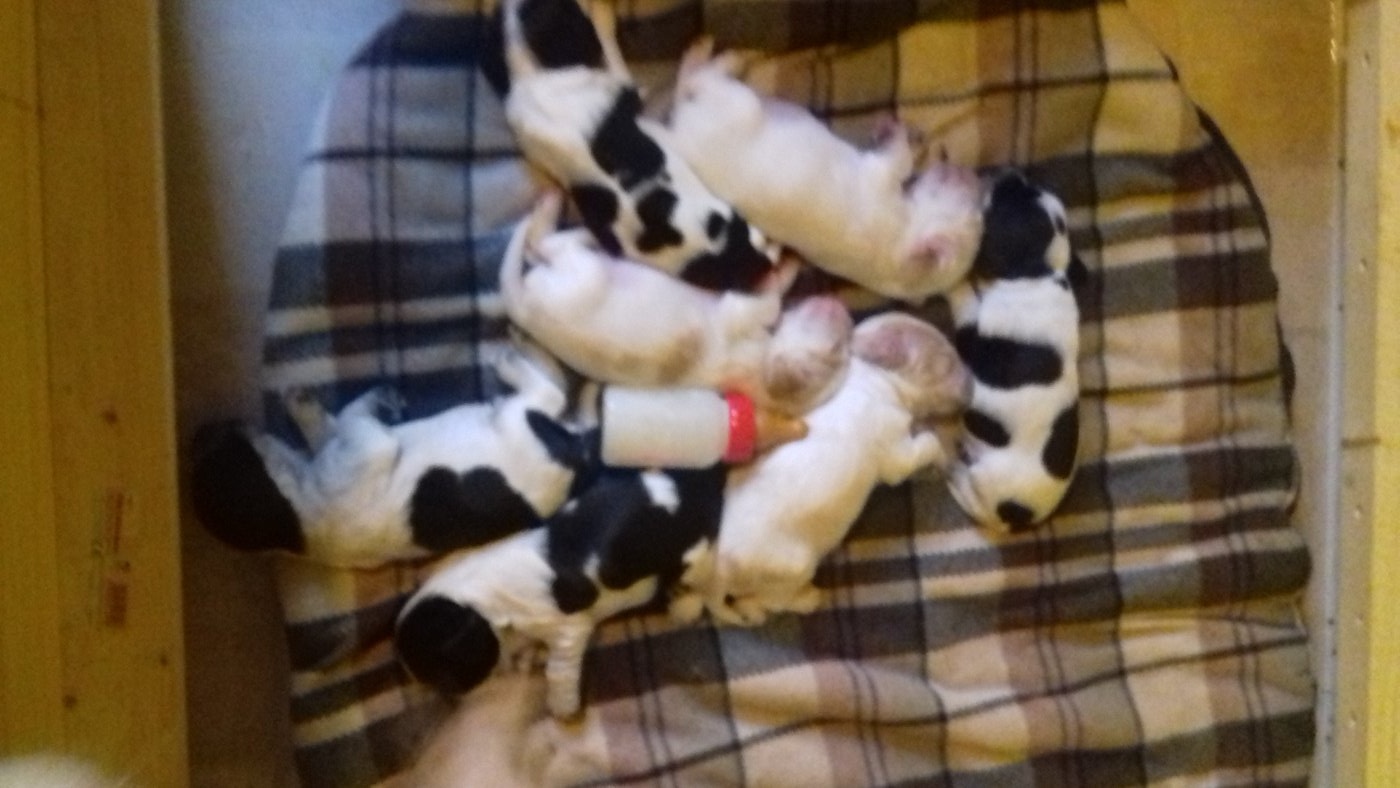 Die Mutter schaut ganz stolz in die Kamera als würde sie sagen wollen: Hier ist mein Welpengarten :a37