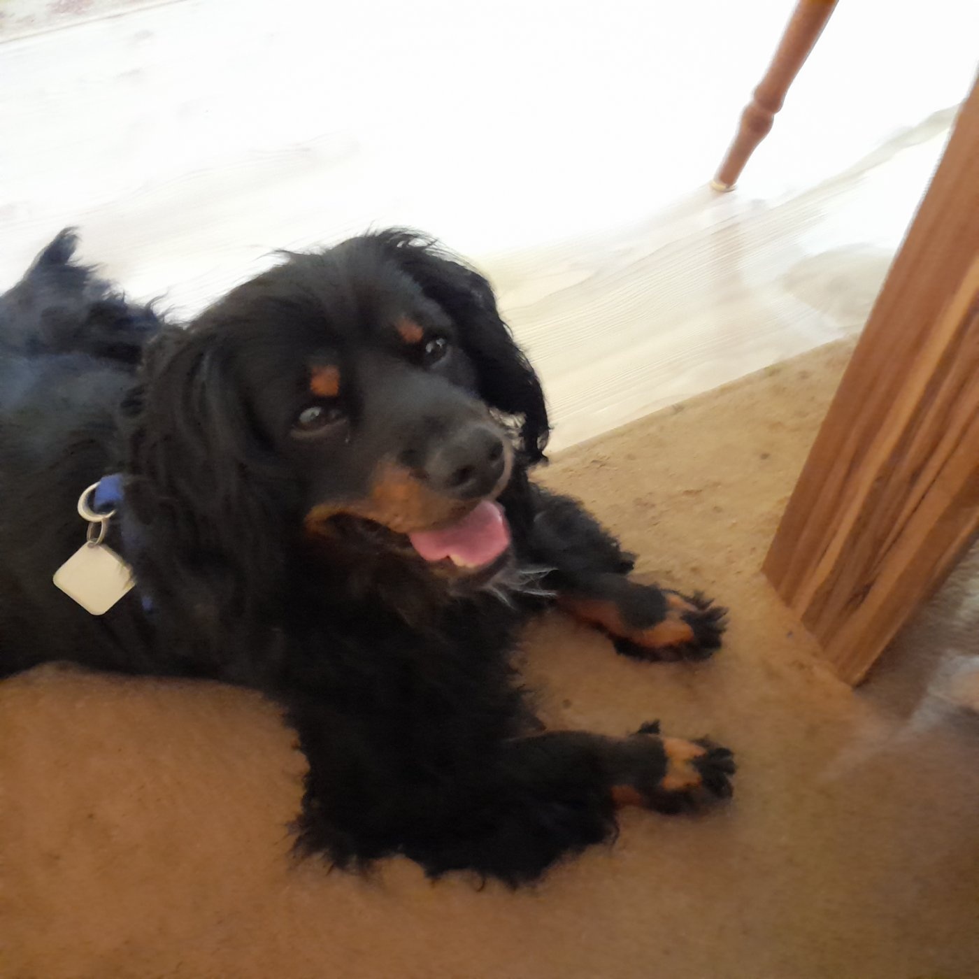 Nun ist er zur Ruhe gekommen und liegt schnarchend unterm Tisch.