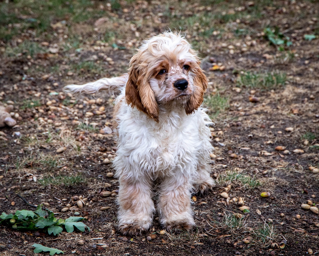 Bingo, Rüde, Amicocker, weiss-rot, 6 Monate