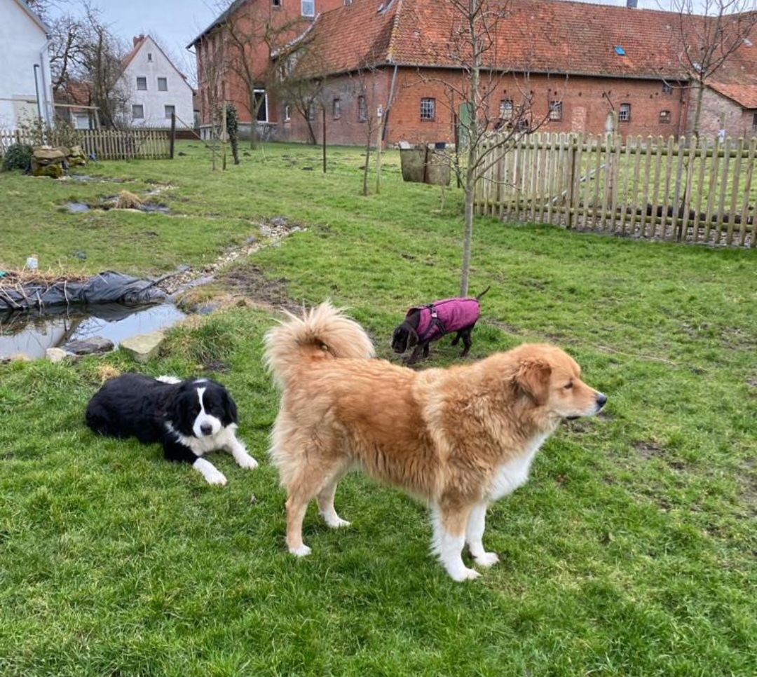 Ruby hat sich schon gut eingelebt in ihrem neuen Zuhause. Mit ihren Hundekumpels Sam und Teddy kommt sie gut zurecht und die Jungs haben sie direkt adoptiert.