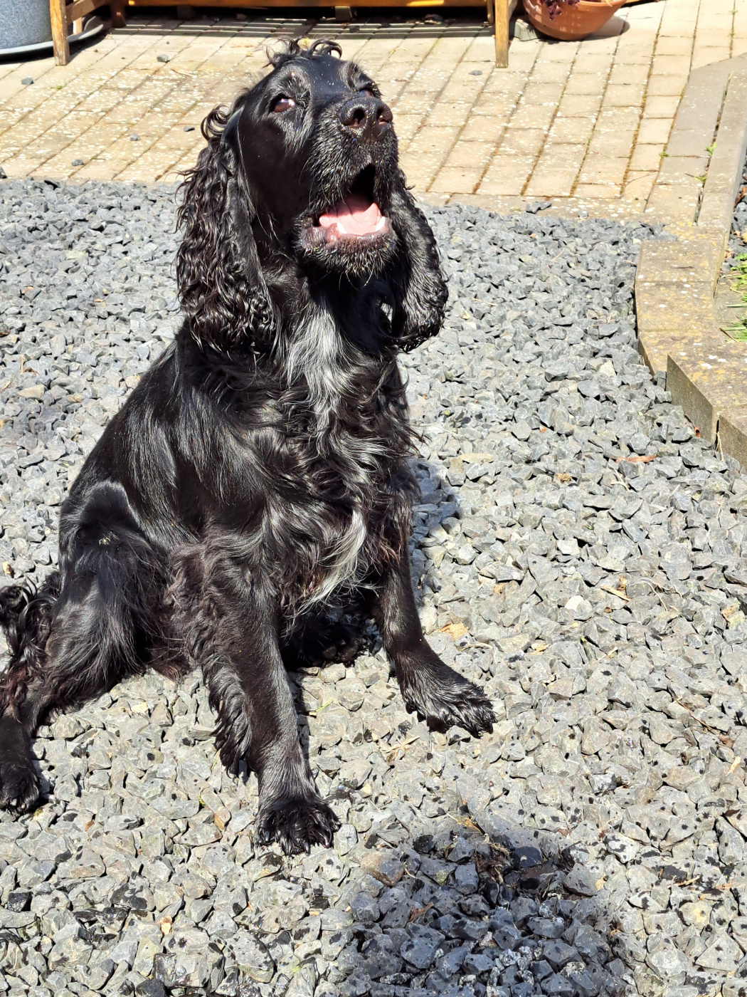 Wenn er länger als 2 Minuten alleine im Garten ist, muß man gucken gehen, dann stellt er wieder irgend etwas an. Letztens haben wir das gesamte Wurzelwerk aus unserem Miniteich rausgeholt und sauber gemacht, Sky war voll in seinem Element, das war voll sein Ding